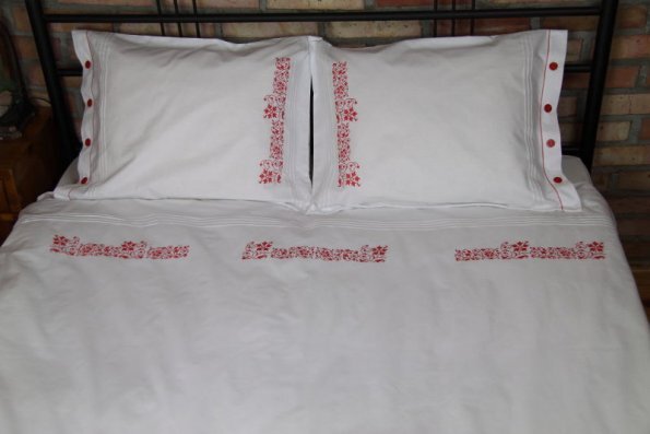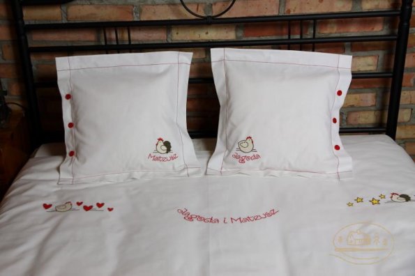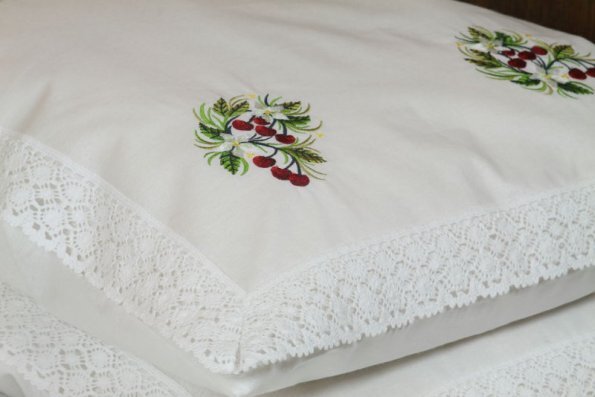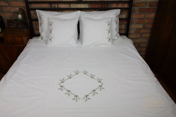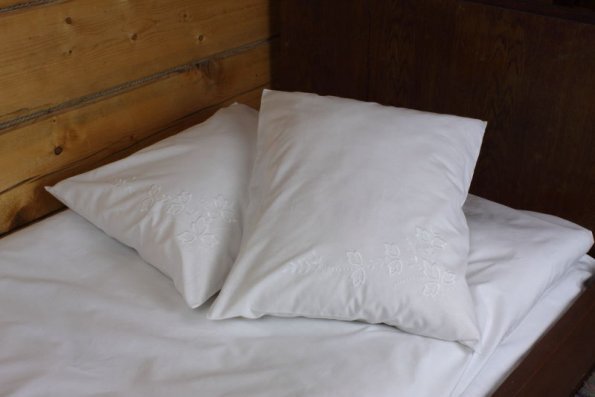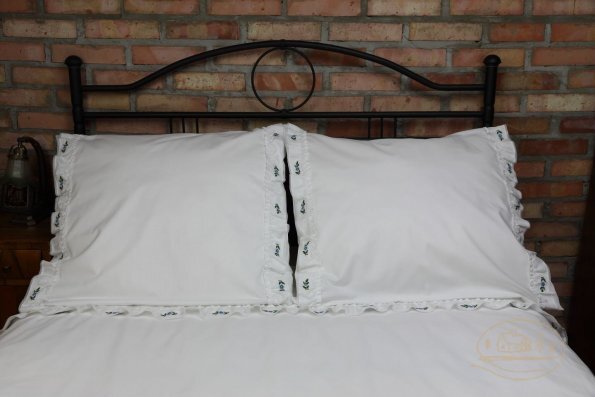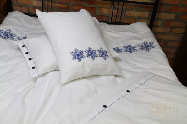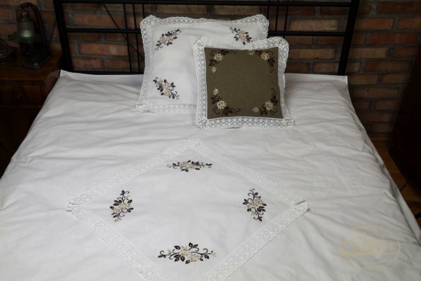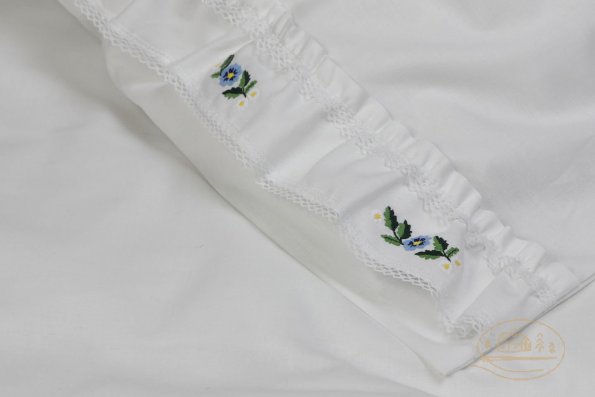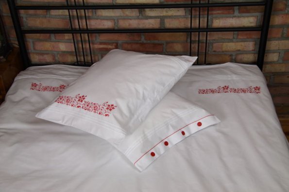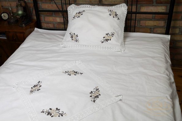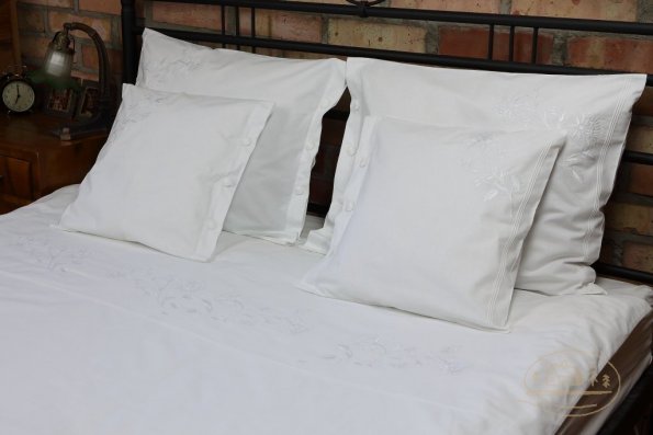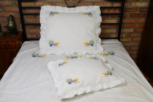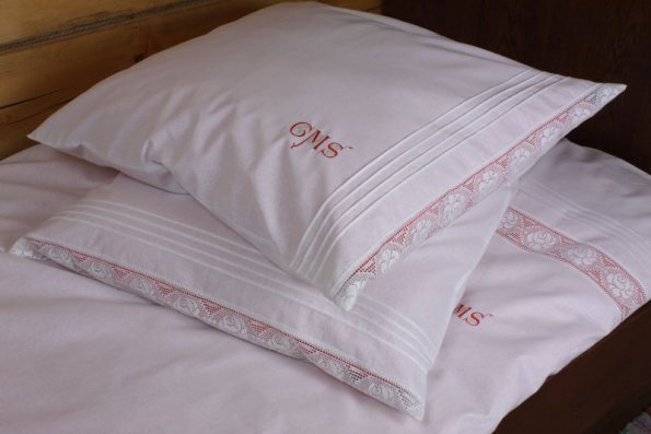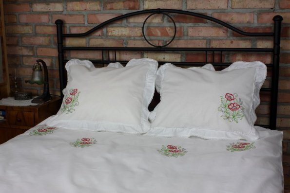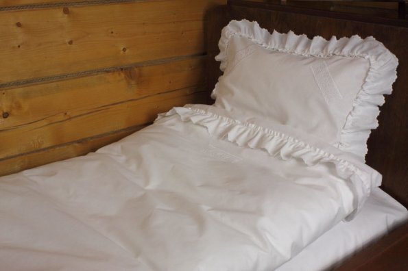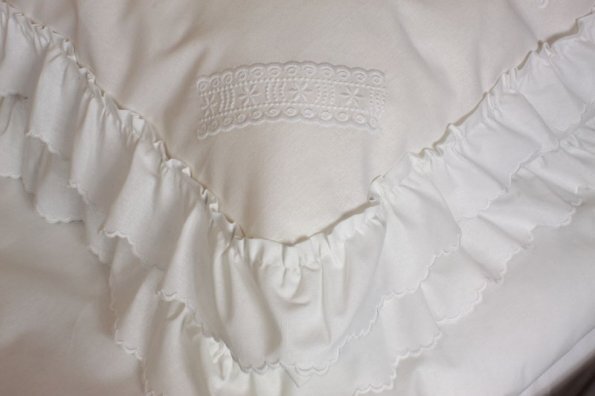 Pościel z białego bawełnianego płótna, ozdobiona koronkami, haftamii szczypankami.