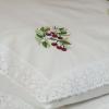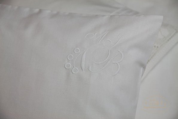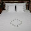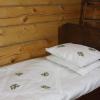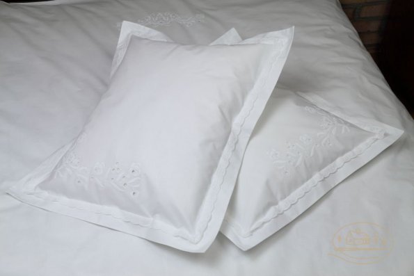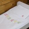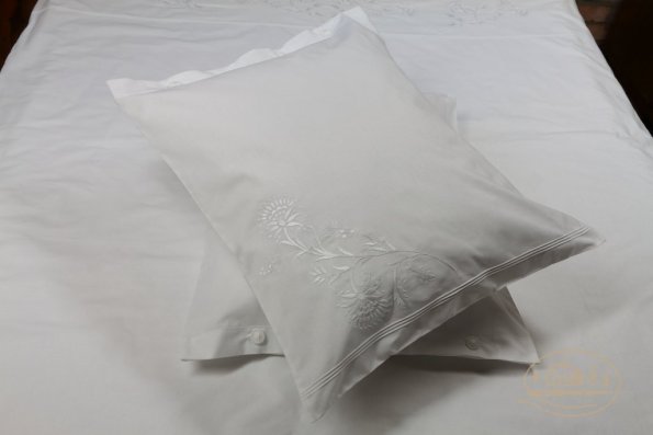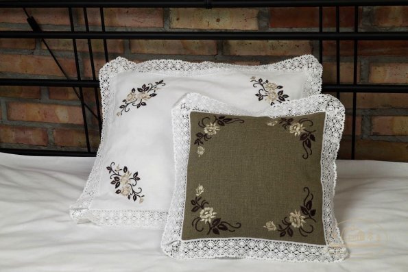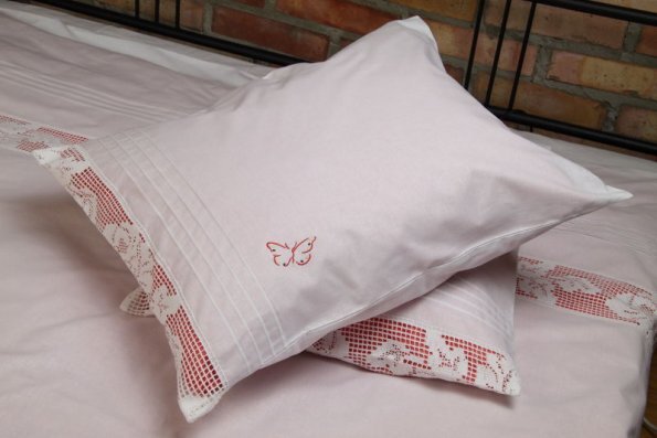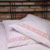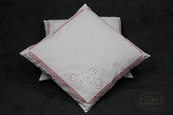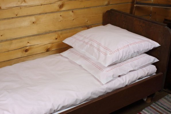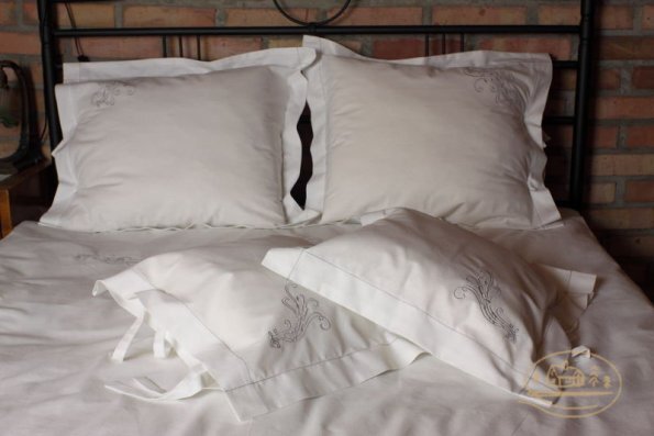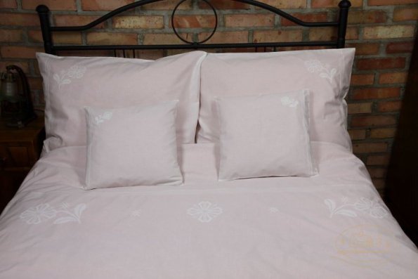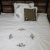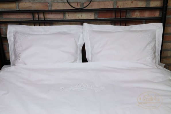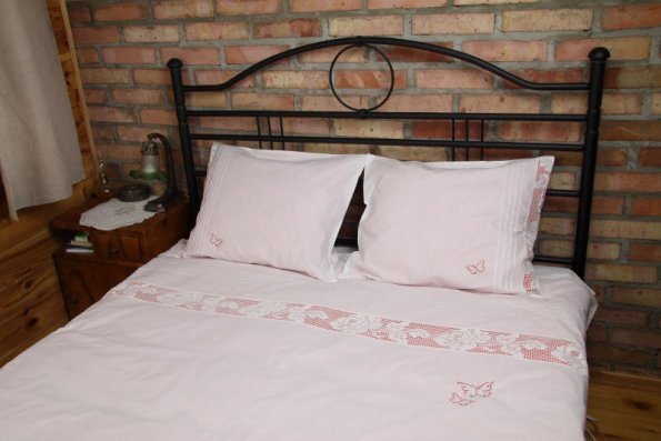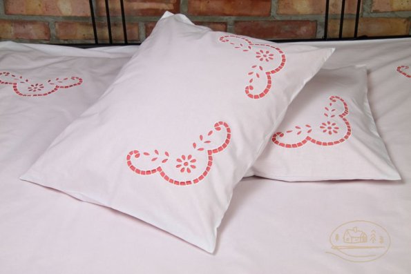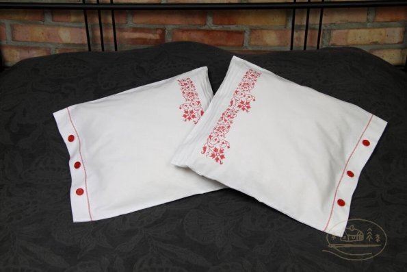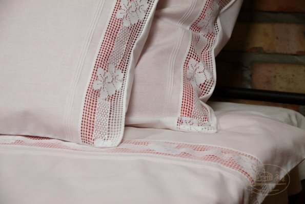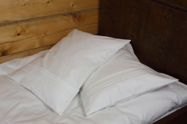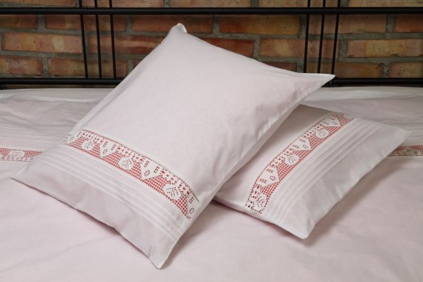 Pościel z białego bawełnianego płótna, ozdobiona koronkami, haftamii szczypankami.