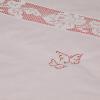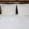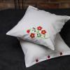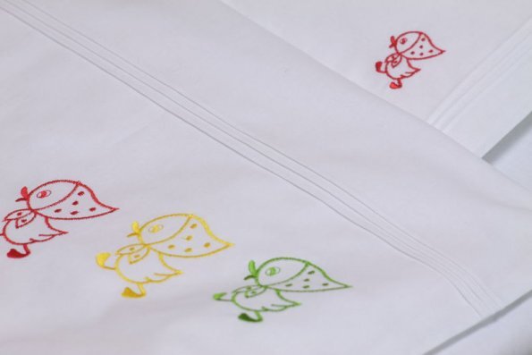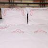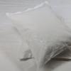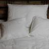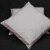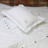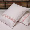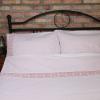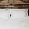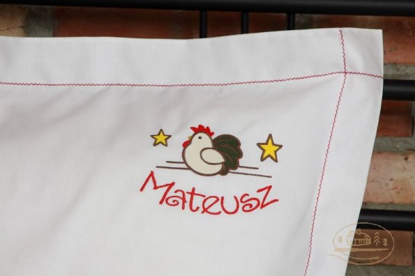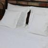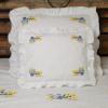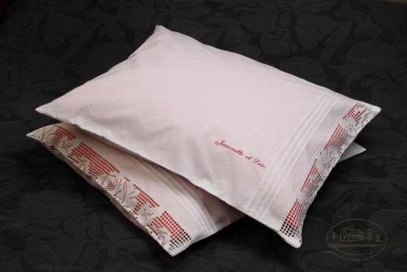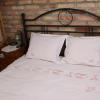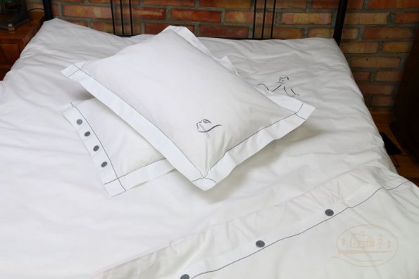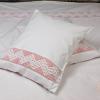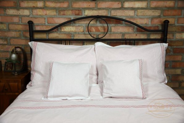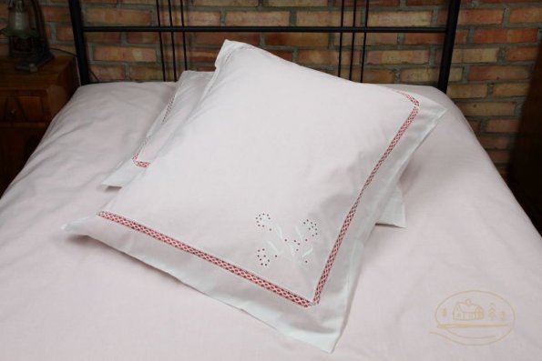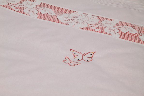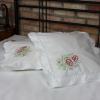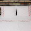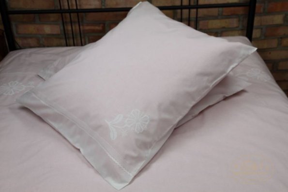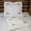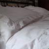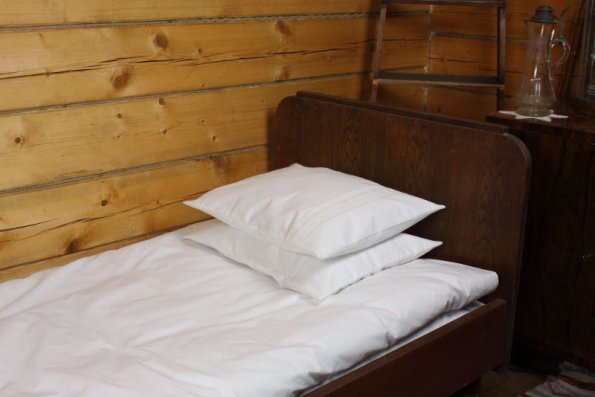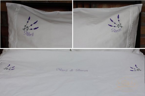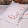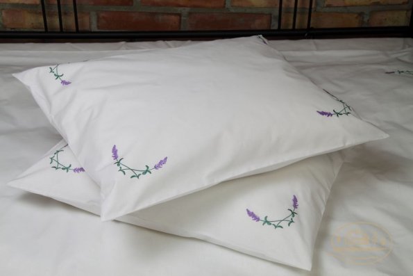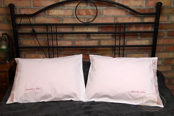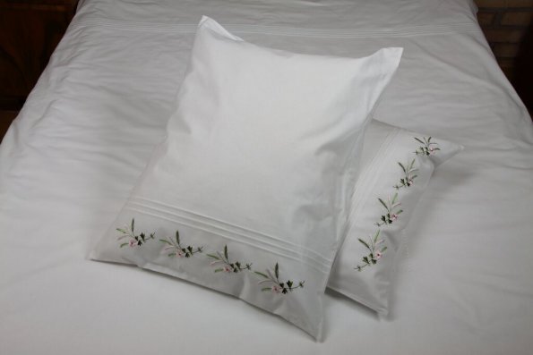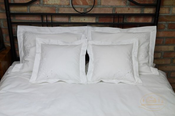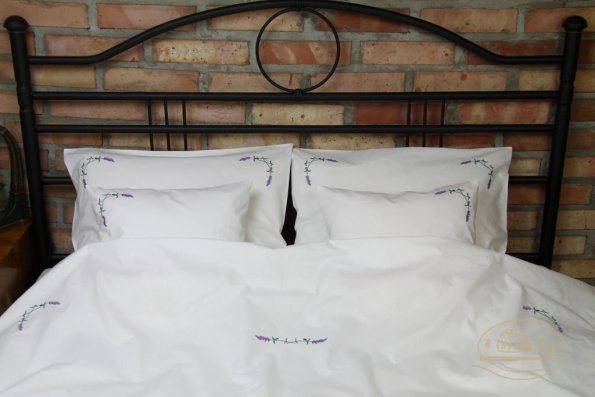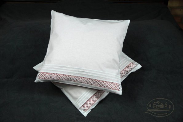 Pościel z białego bawełnianego płótna, ozdobiona koronkami, haftamii szczypankami.
