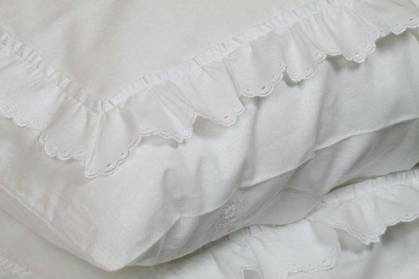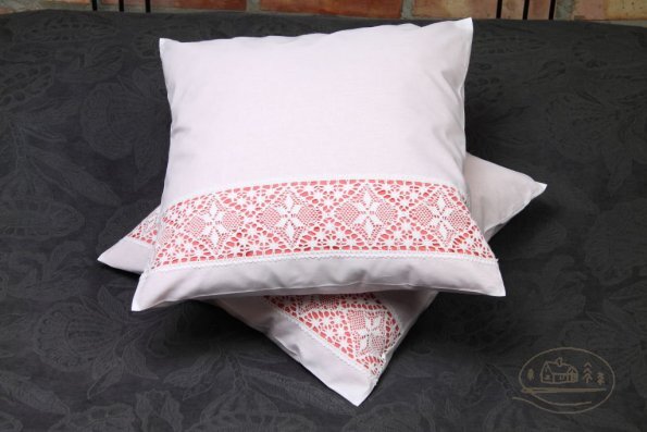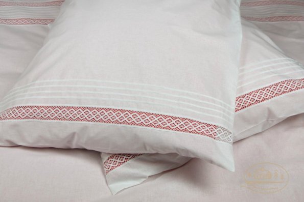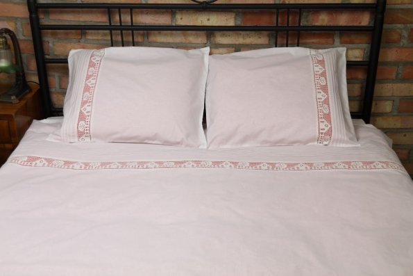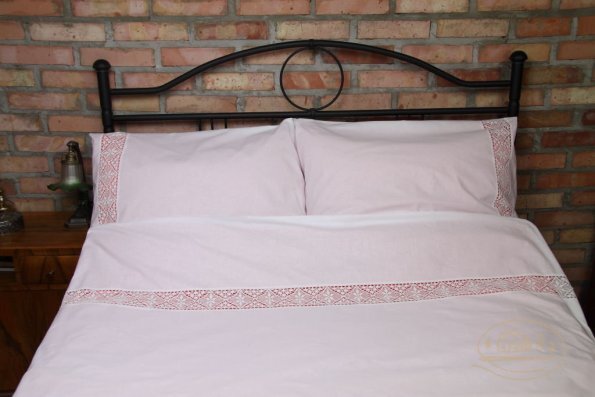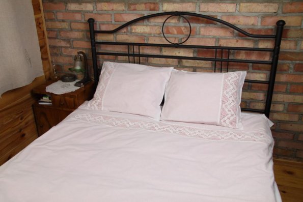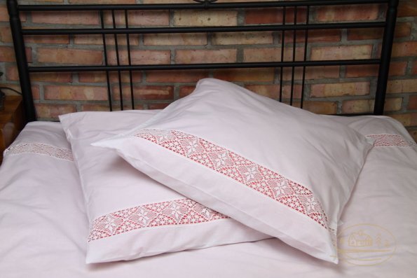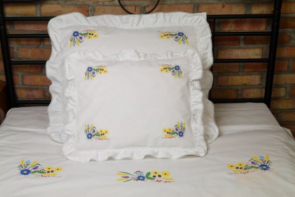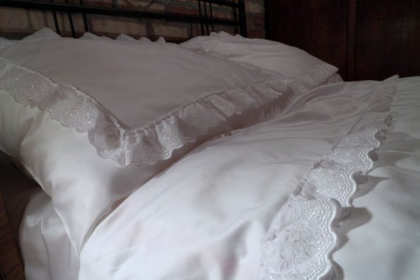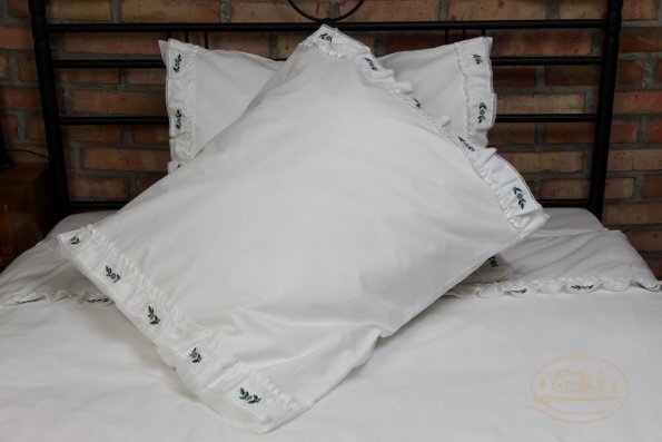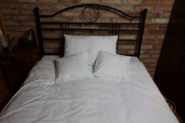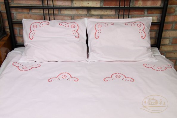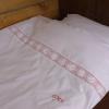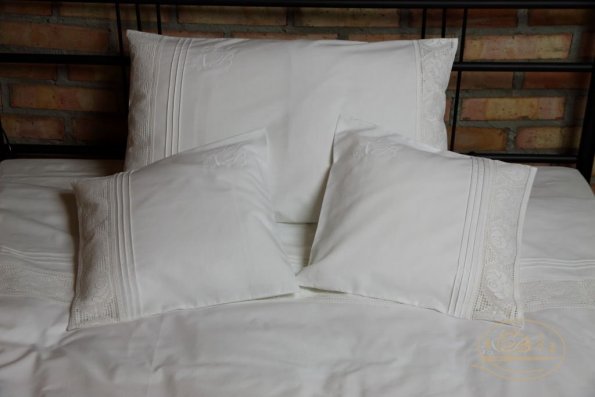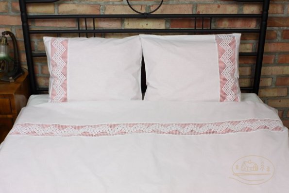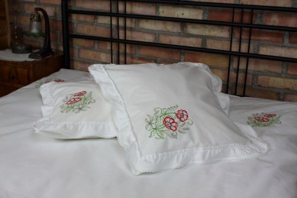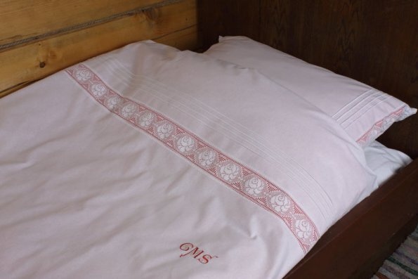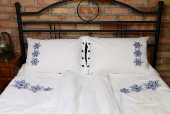 Pościel z białego bawełnianego płótna, ozdobiona koronkami, haftamii szczypankami.