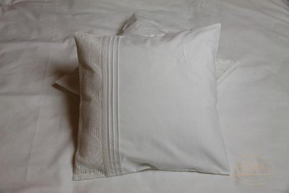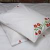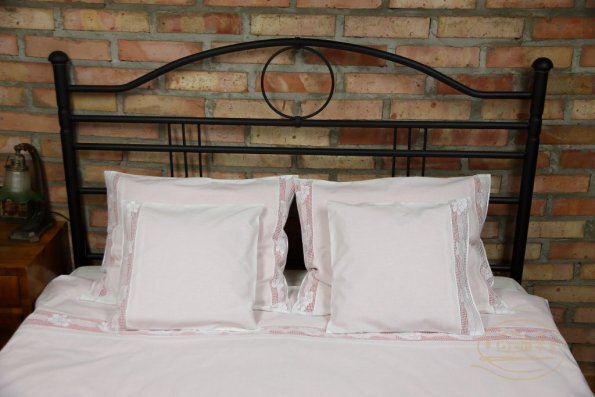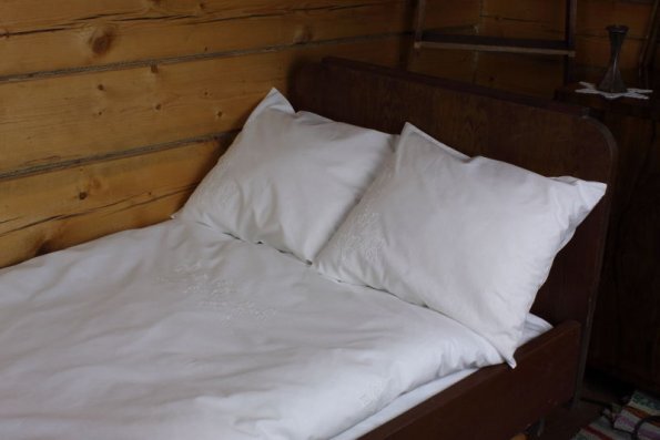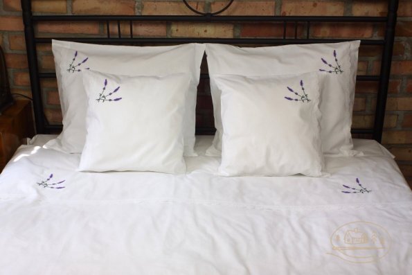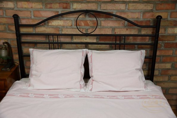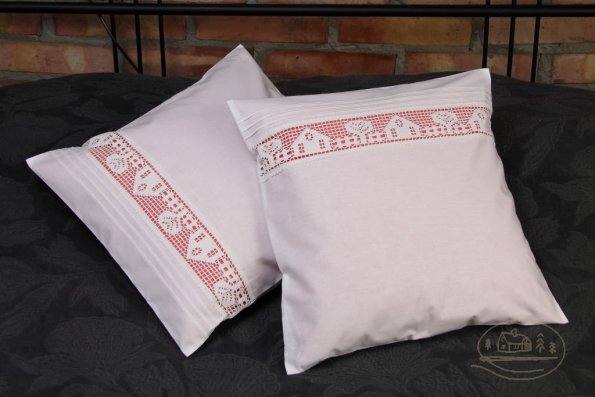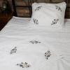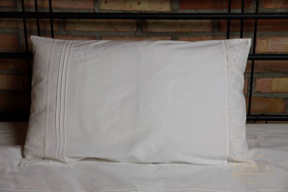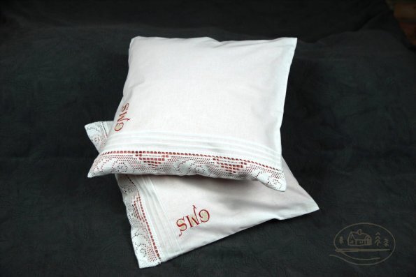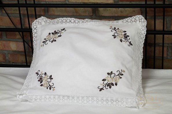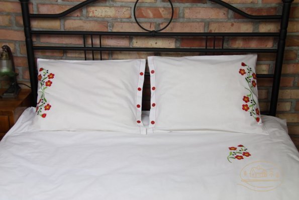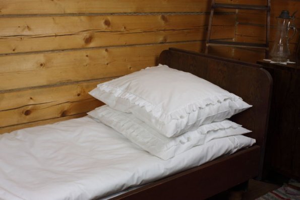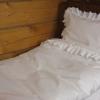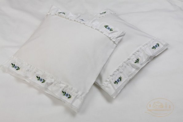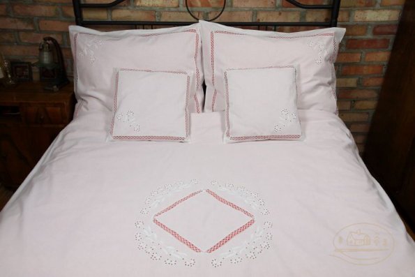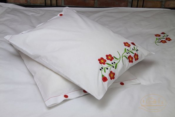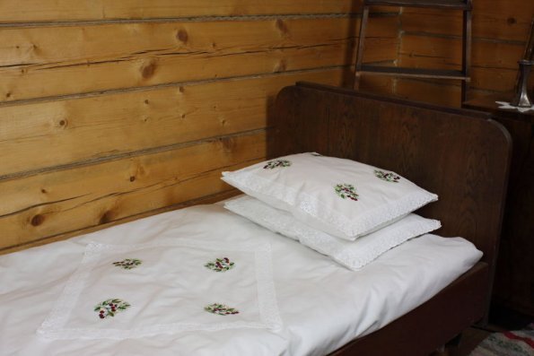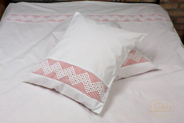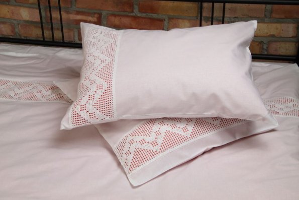 Pościel z białego bawełnianego płótna, ozdobiona koronkami, haftamii szczypankami.